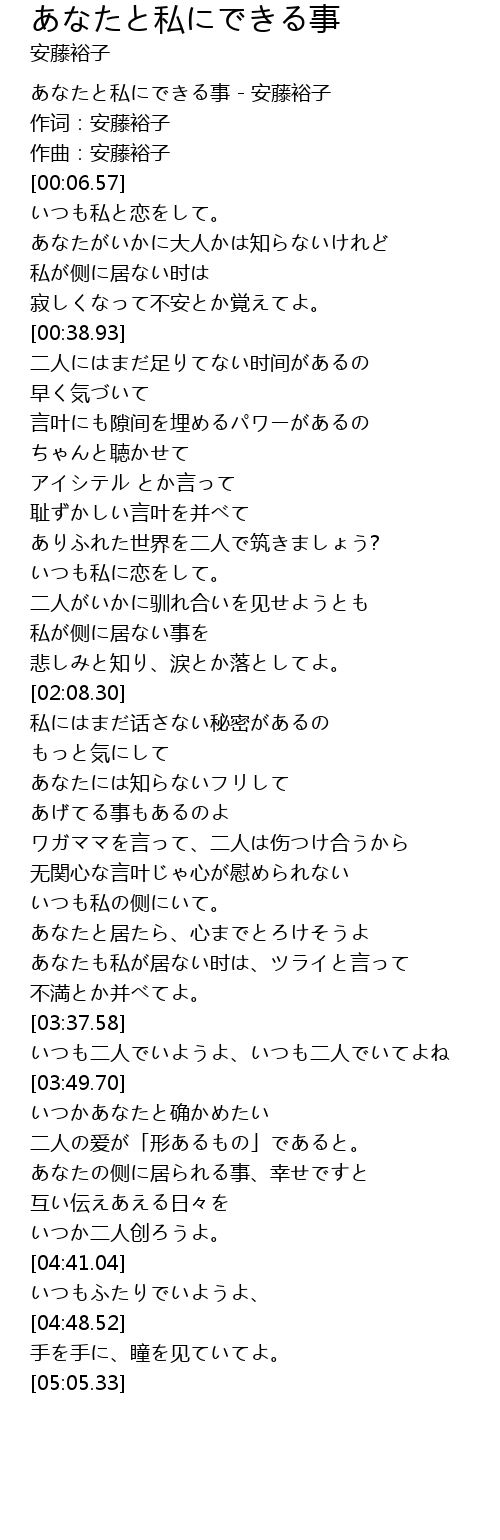 | [00:00.64] | あなたと私にできる事 - 安藤裕子 |