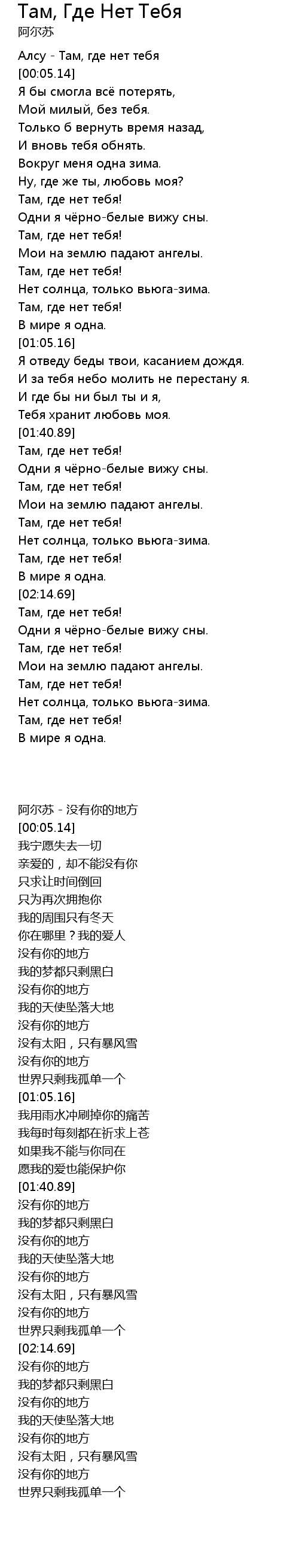 | [00:00.00] | 阿尔苏 - 没有你的地方 |