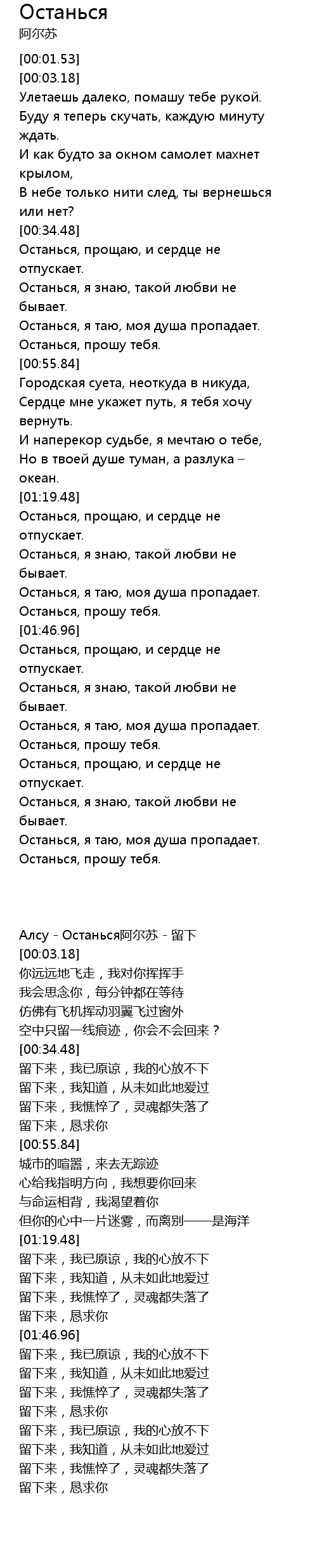| [00:01.53] | Алсу - Останься阿尔苏 - 留下 |