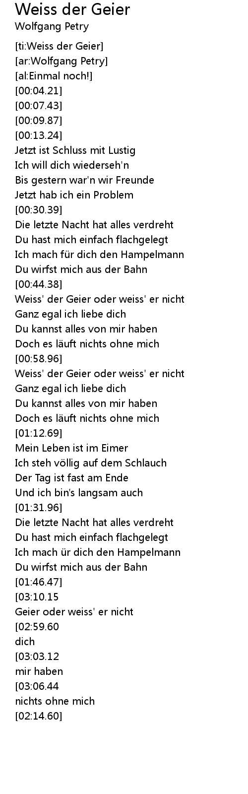 | [00:59.94] | Weiss' der Geier oder weiss' er nicht |