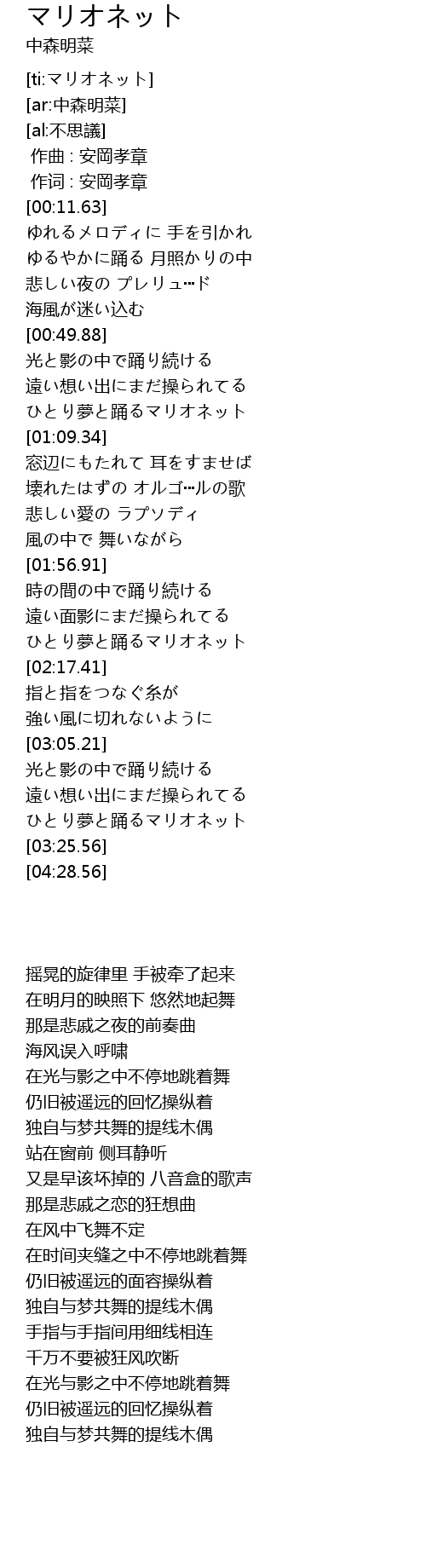 | [03:17.94] | ひとり夢と踊るマリオネット |