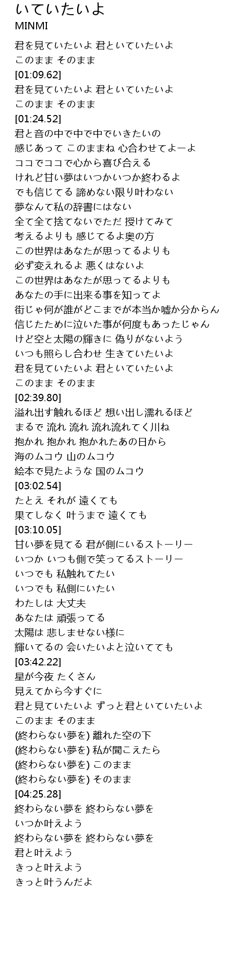 | [03:55.50] | 君と見ていたいよ ずっと君といていたいよ |
