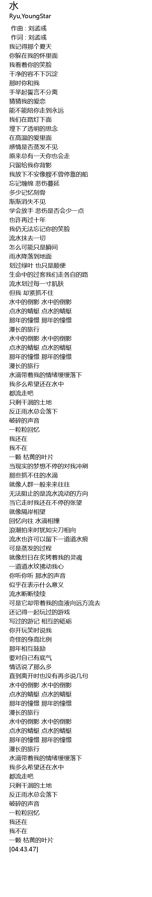 | [03:36.96] | shuǐ zhōng de dào yǐng shuǐ zhōng de dào yǐng |