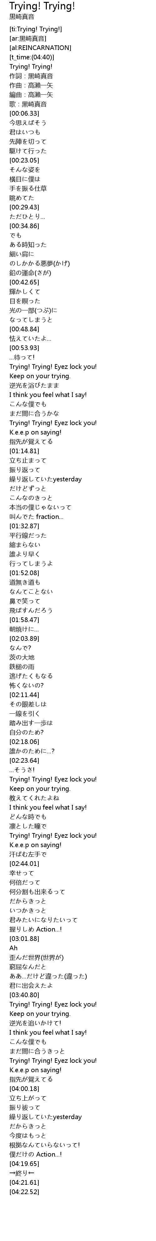 | [00:55.66] | Trying! Trying! Eyez lock you! |