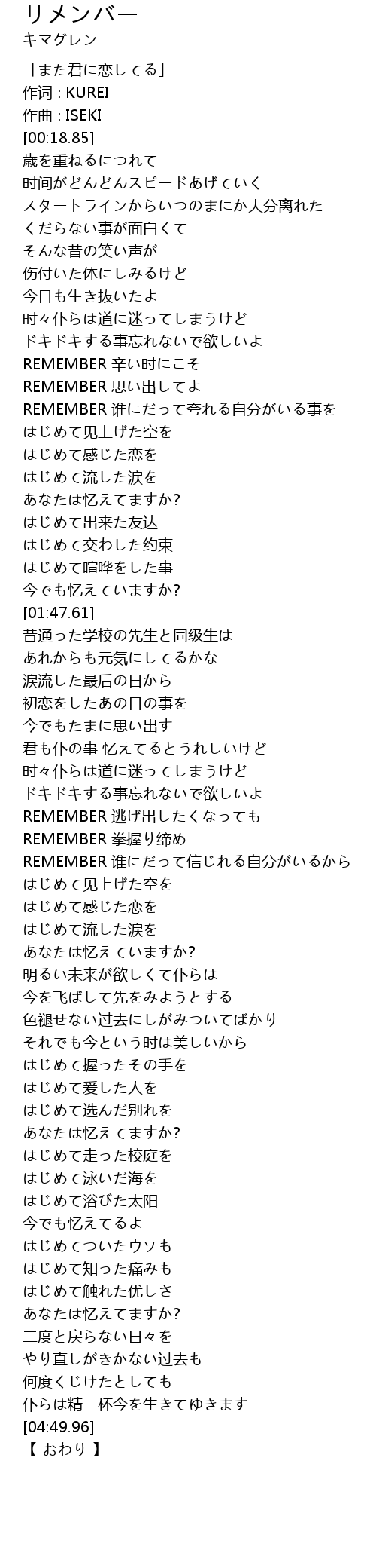 | [01:03.28] | REMEMBER 思い出してよ |