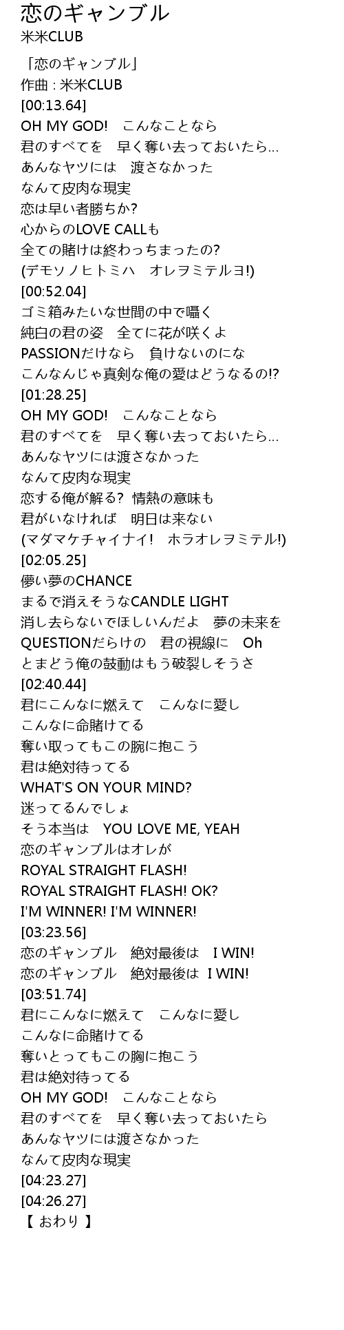 | [03:38.38] | 恋のギャンブル 絶対最後は I WIN! |