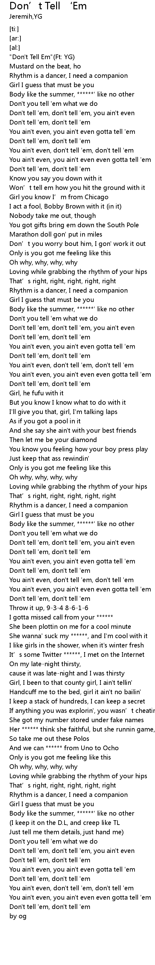 | [00:00.00] | " Don' t Tell Em" Ft: YG |