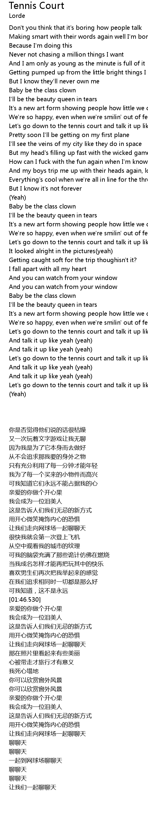 Let's go down to the tennis court and talk it up like yeah (yeah) |