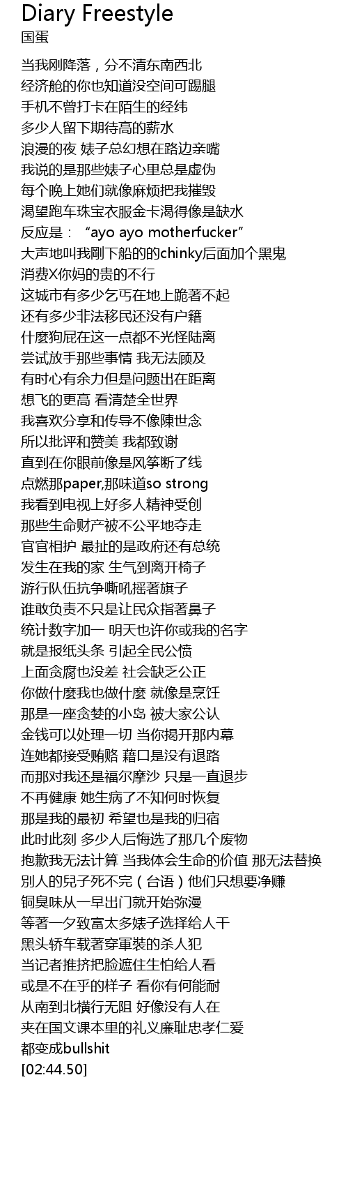 | [00:41.65] | 我说的是那些婊子心里总是虚伪 |