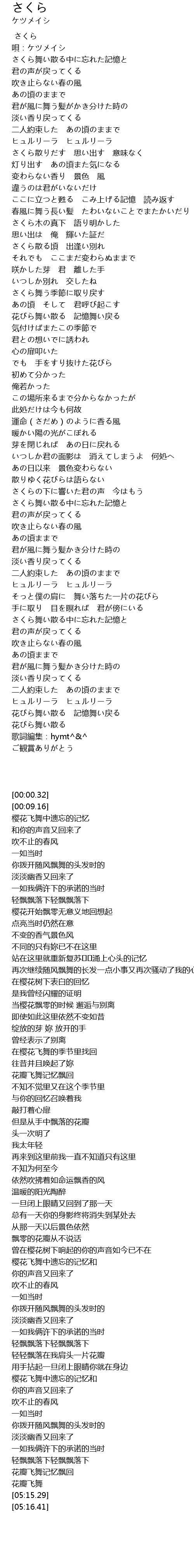 | [00:12.64] | さくら舞い散る中に忘れた記憶と |
