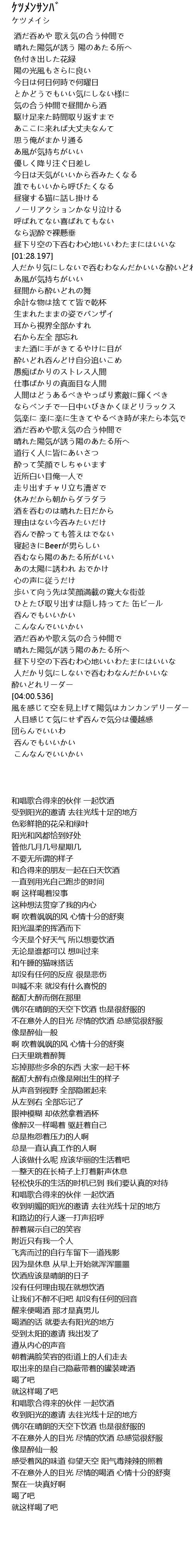 | [03:52.178] | 人だかり気にしないで呑むわなんだかいいな 酔いどれリーダー |