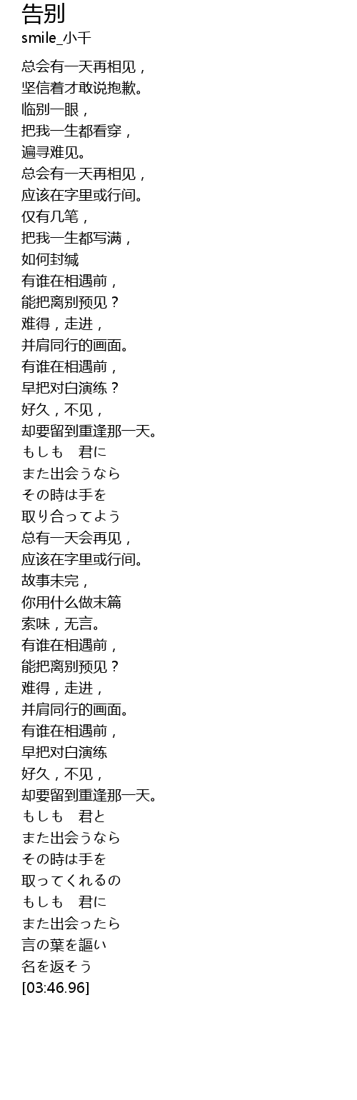 | [00:50.18] | zǒng huì yǒu yì tiān zài xiāng jiàn, |