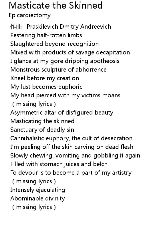 | [01:19.718] | I'm peeling off the skin carving on dead flesh |