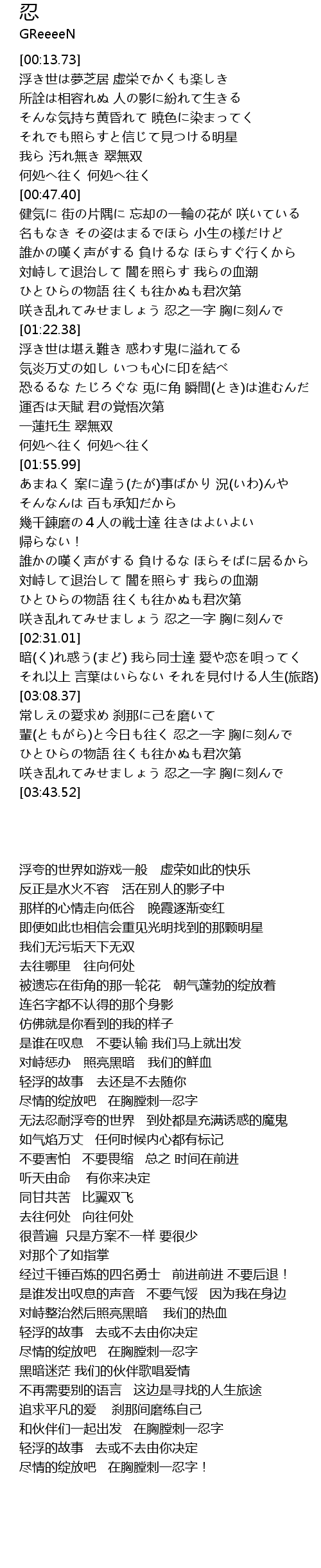 | [03:37.25] | 尽情的绽放吧 在胸膛刺一忍字! |