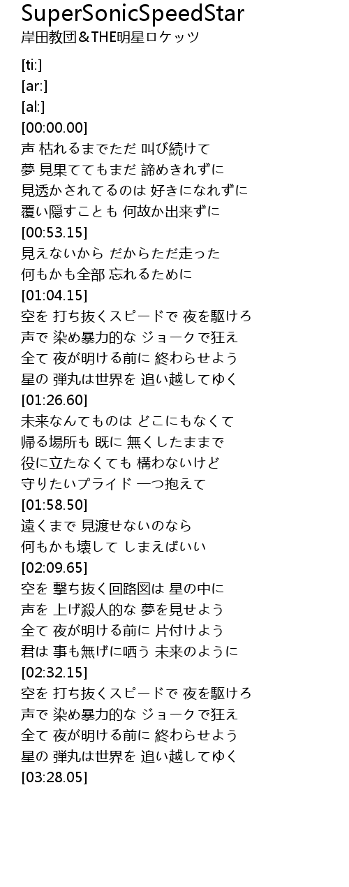 | [03:22.55] | 星の 弾丸は世界を 追い越してゆく |