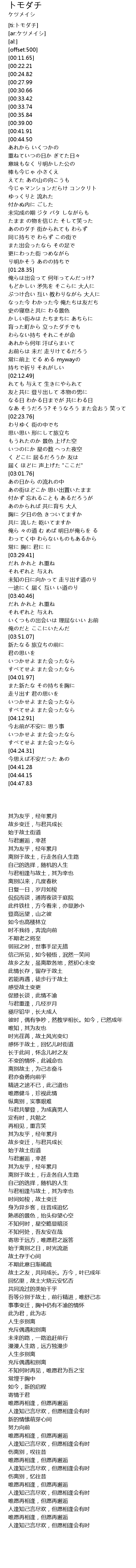 | [02:36.92] | 离别于故土,行走各自人生路 |