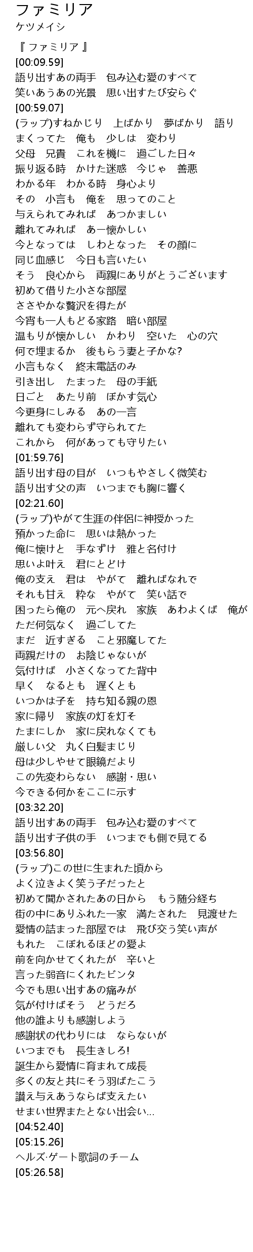 | [02:57.55] | 困ったら俺の 元へ戻れ 家族 あわよくば 俺が 守る |