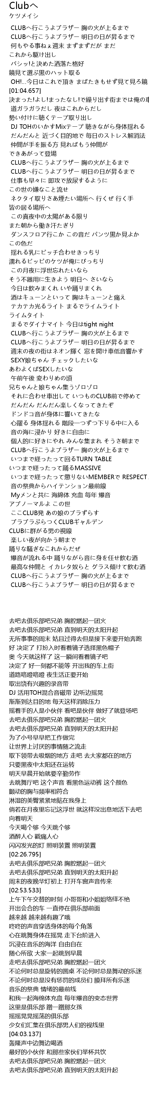 | [04:27.899] | CLUBへ行こうよブラザー 胸の火が上るまで |