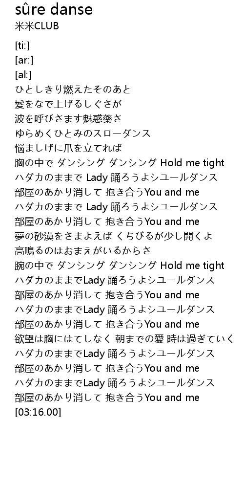 | [01:54.00] | 腕の中で ダンシング ダンシング Hold me tight |