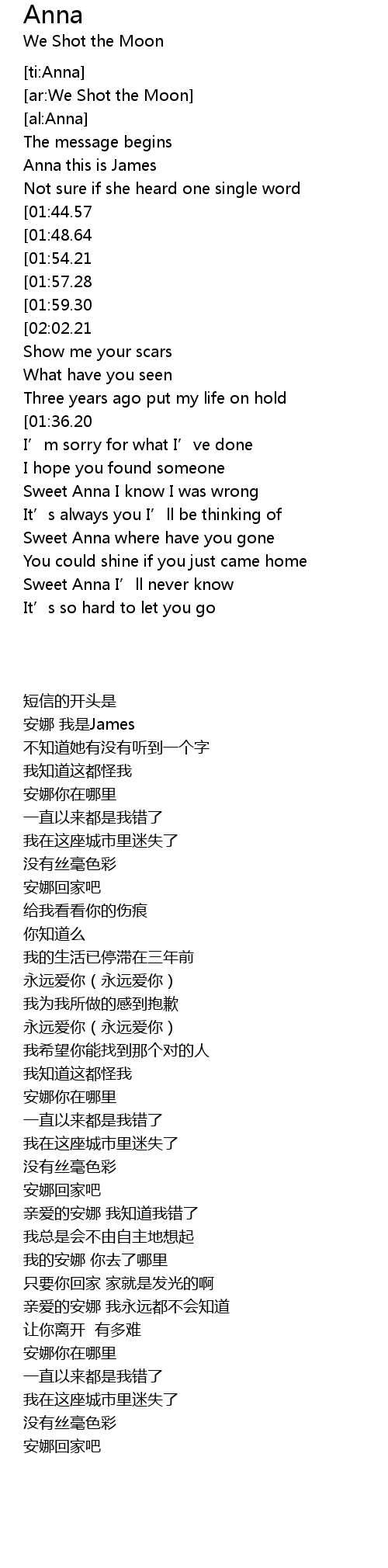 | [00:24.56][01:48.64][02:54.90] | Anna where are you |