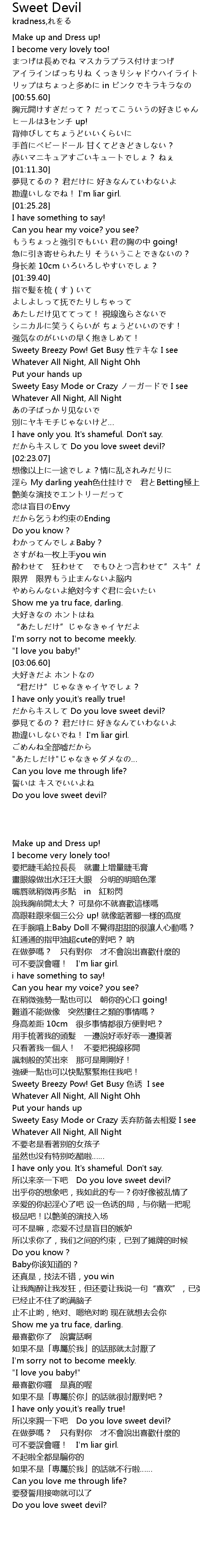 | [02:19.99] | Do you love sweet devil? |