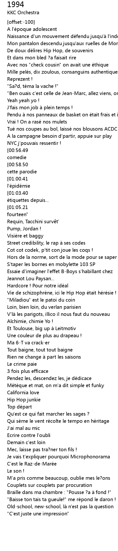 | [01:28.57] | Vie de schizophrè ne, ici le Hip Hop é tait hé ré sie ! |