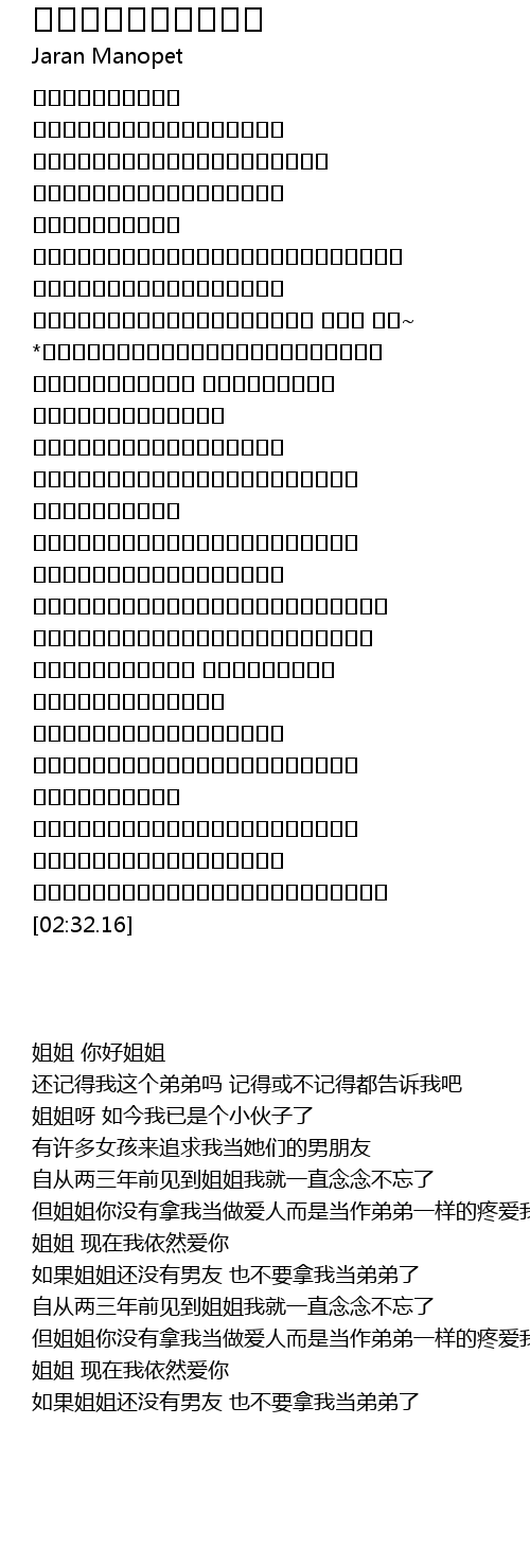 | [02:01.88] | ฮักเป็นพี่สาว บ่ได้มาเอาเป็นแฟน พี่ก้อฮักผมเป็นน้องชาย |