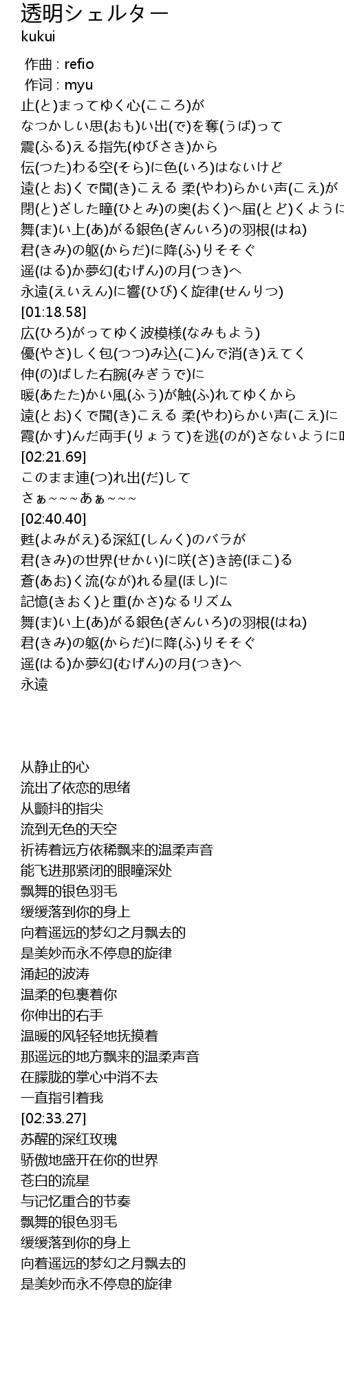 | [00:52.06] | 舞(ま)い上(あ)がる銀色(ぎんいろ)の羽根(はね) |
