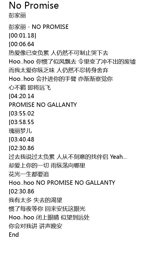 | [00:00.00] | 彭家丽-NO PROMISE |