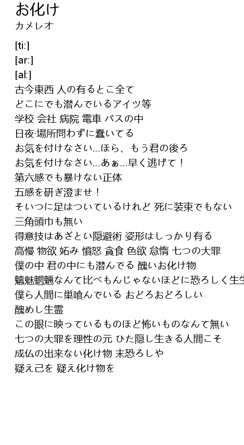 | [00:59.98] | そいつに足はついているけれど 死に装束でもない 三角頭巾も無い |