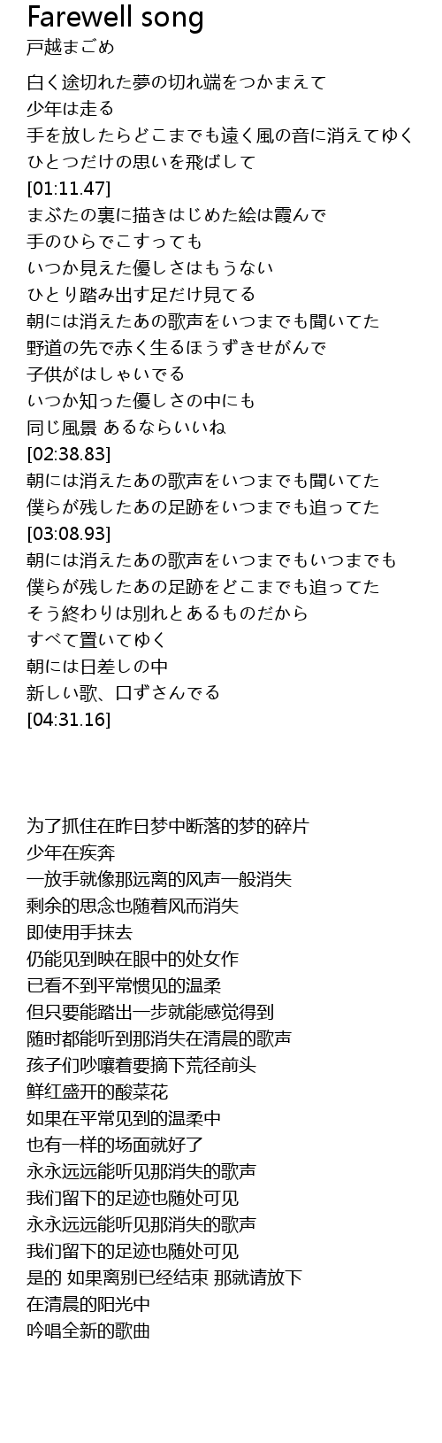 | [00:46.44] | 手を放したらどこまでも遠く風の音に消えてゆく |