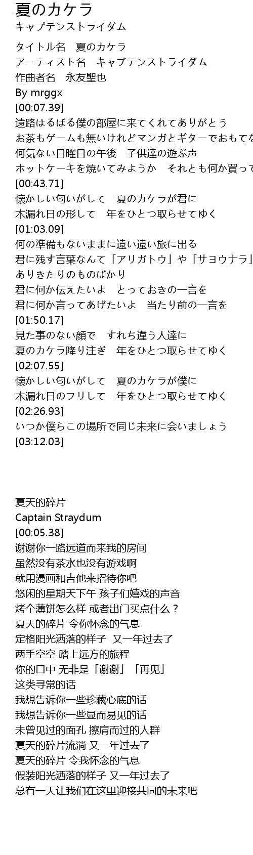 | [00:00.40] | タイトル名 夏のカケラ |