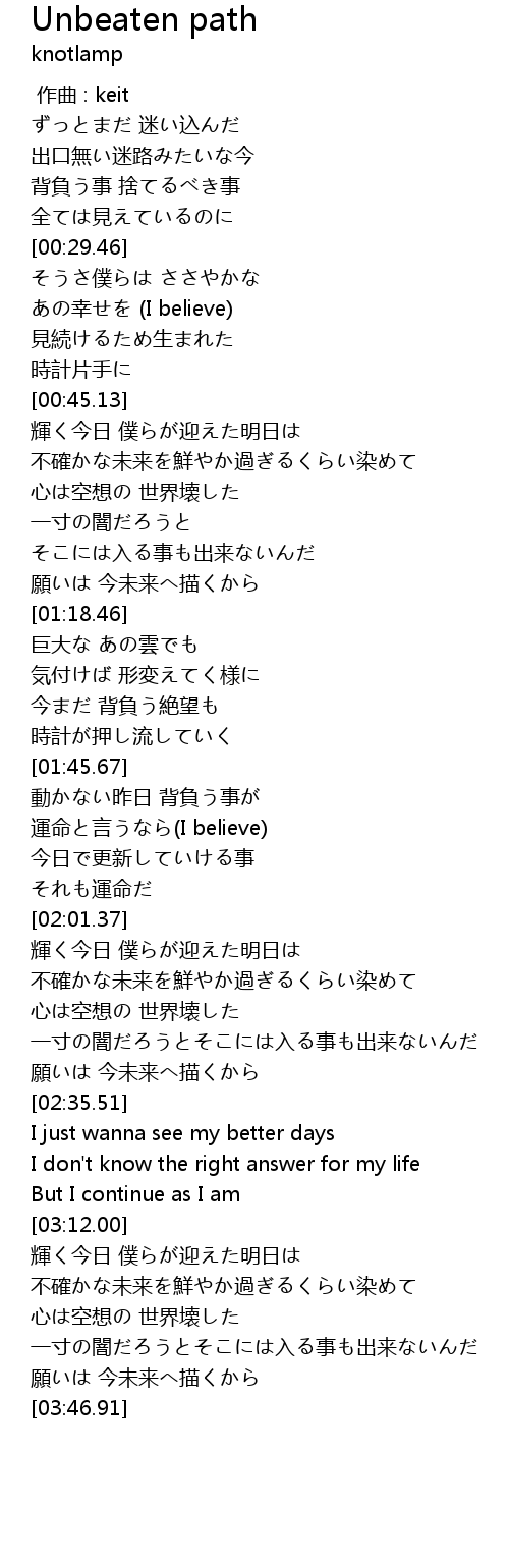 | [03:17.87] | 不確かな未来を鮮やか過ぎるくらい染めて |