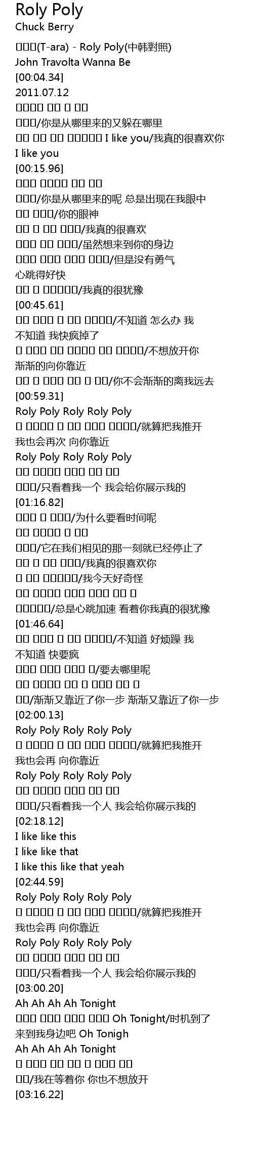 | [00:00.09] | 티아라(T-ara) - Roly Poly(中韩對照) |