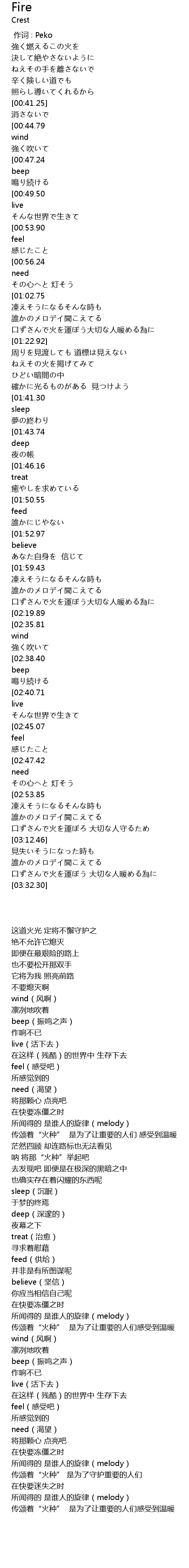 | [01:11.93] | 口ずさんで火を運ぼう大切な人暖める為に |