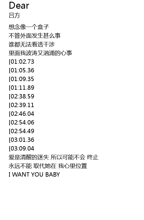 | [03:25.09][02:38.59][01:17.14] | DEAR |