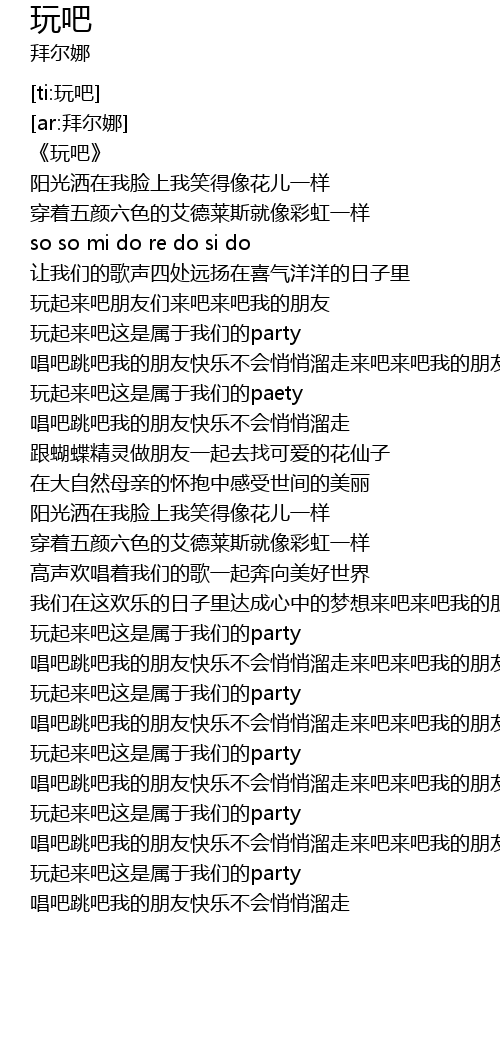 | [02:25.371] | 唱吧跳吧我的朋友快乐不会悄悄溜走来吧来吧我的朋友 |