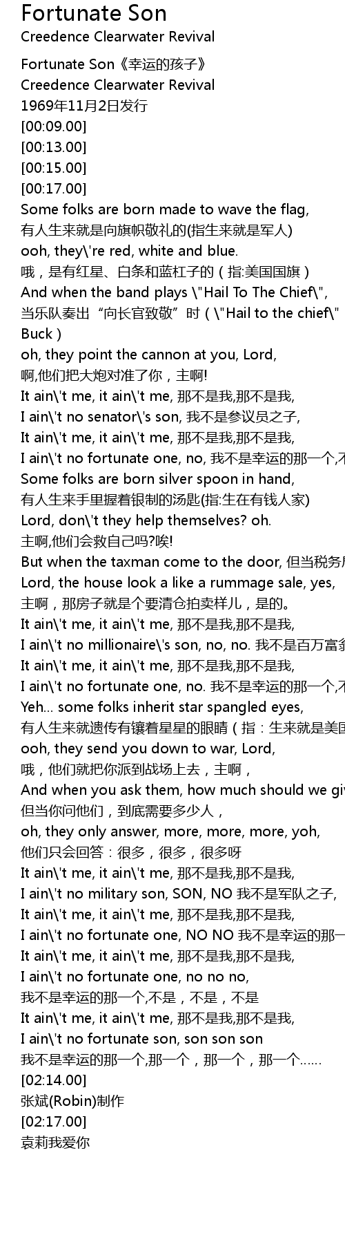 | [02:11.00] | I ain\'t no fortunate son, son son son 我不是幸运的那一个,那一个,那一个,那一个…… |