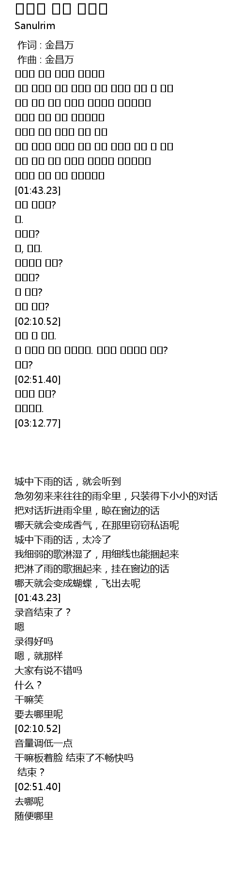 | [00:31.41] | 바삐 오가는 우산 속에는 작은 얘기만 담을 수 있네 |