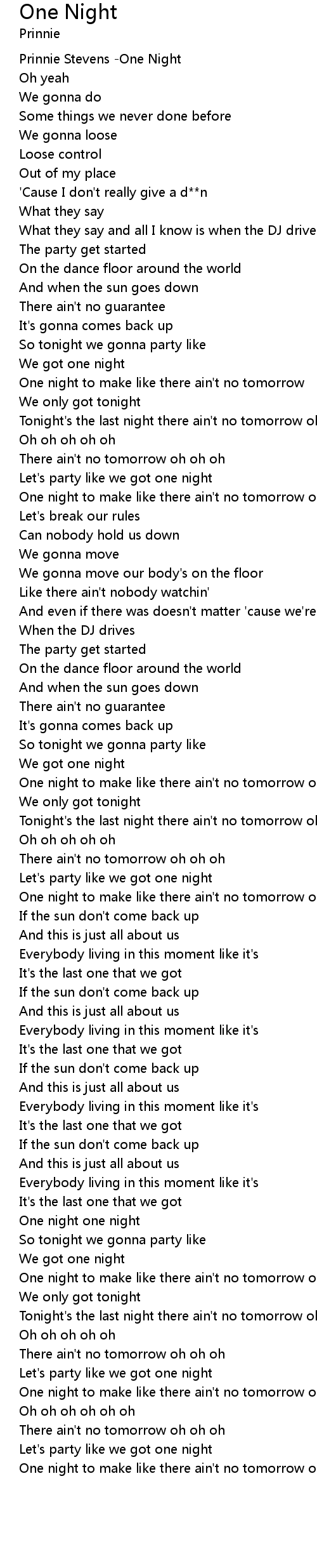 | [00:46.782] | Tonight's the last night there ain't no tomorrow oh oh |