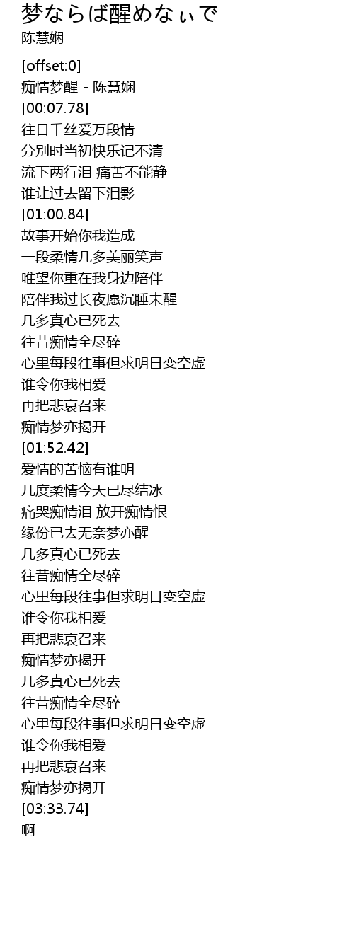 | [00:01.59] | 痴情梦醒 - 陈慧娴 |