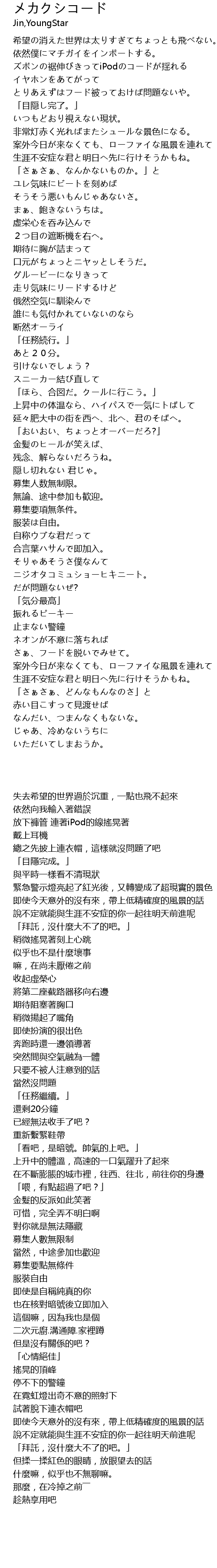 | [00:31.62] | ズボンの裾伸びきってiPodのコードが揺れる |