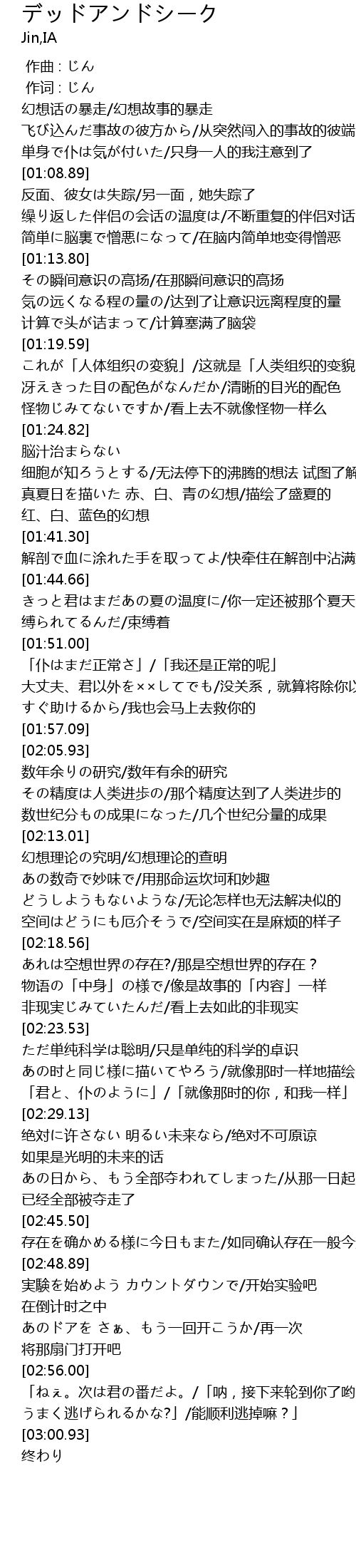 | [01:41.50] | 解剖で血に涂れた手を取ってよ/快牵住在解剖中沾满鲜血的我的手啦 |