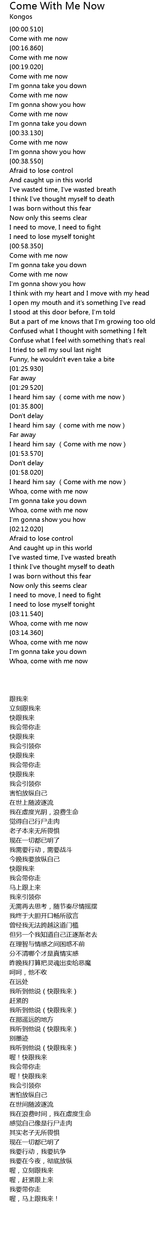 | [01:59.110] | I heard him say (Come with me now) |
