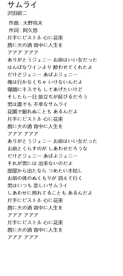| [03:42.54] | 男はいつも 悲しいサムライ |