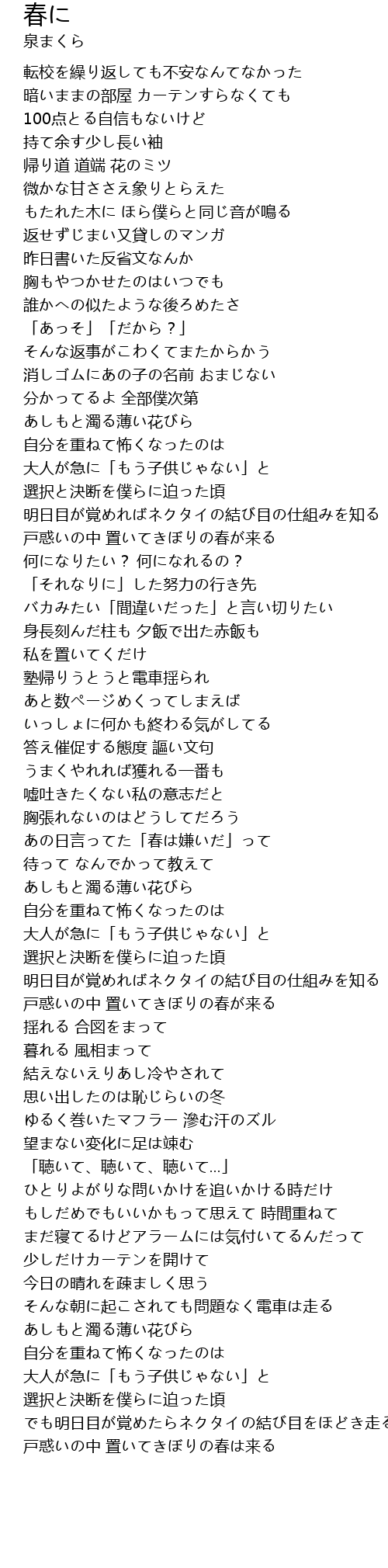| [03:25.700] | 戸惑いの中 置いてきぼりの春が来る |