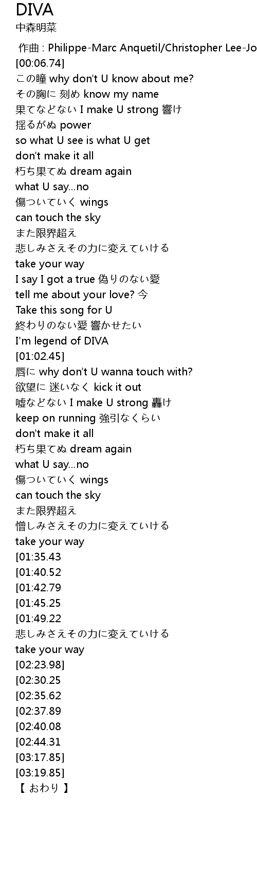 | [03:00.09][02:44.31] | I' m legend of DIVA |