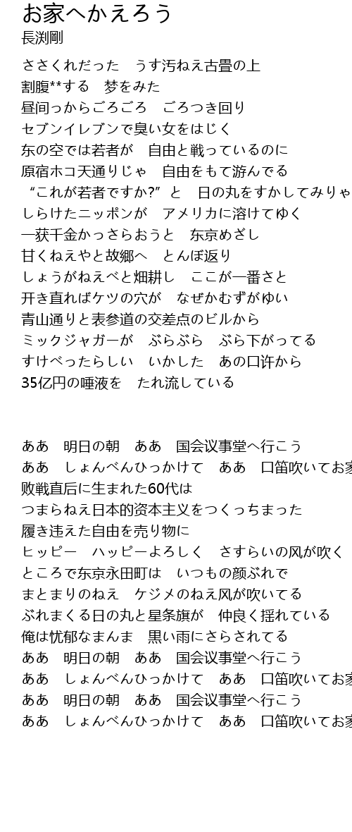 | ああ しょんべんひっかけて ああ 口笛吹いてお家へ帰ろう | |