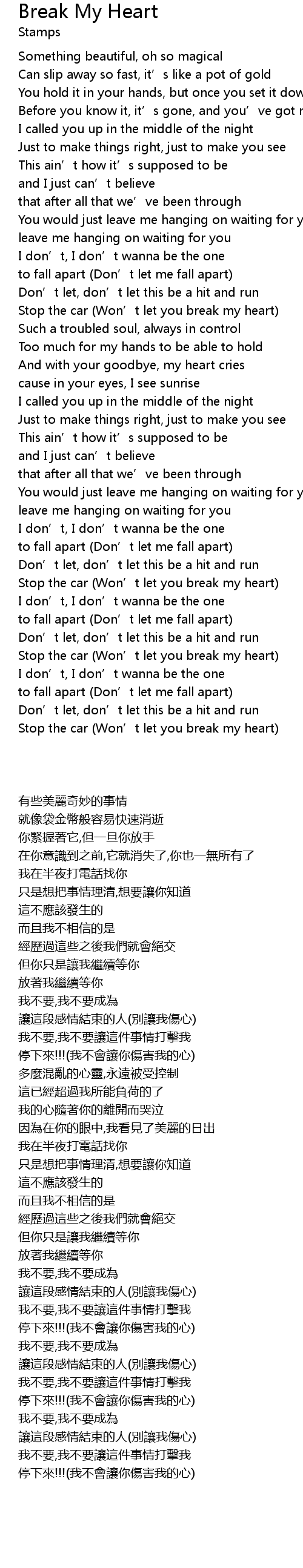 | [03:00.930] | Stop the car Won' t let you break my heart |
