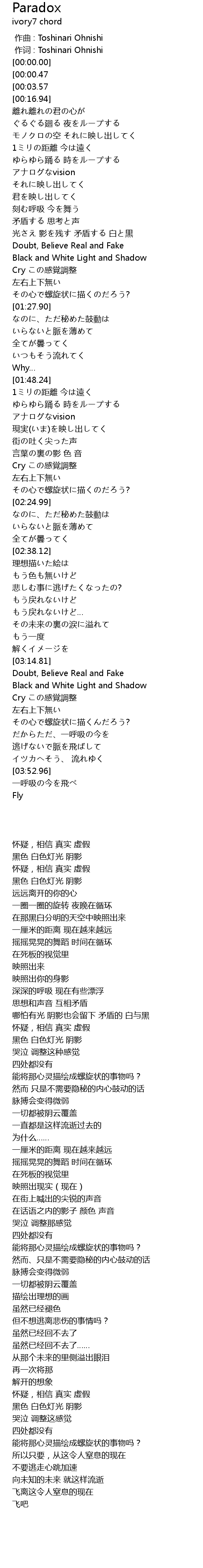| [01:03.56] | 光さえ 影を残す 矛盾する 白と黒 |